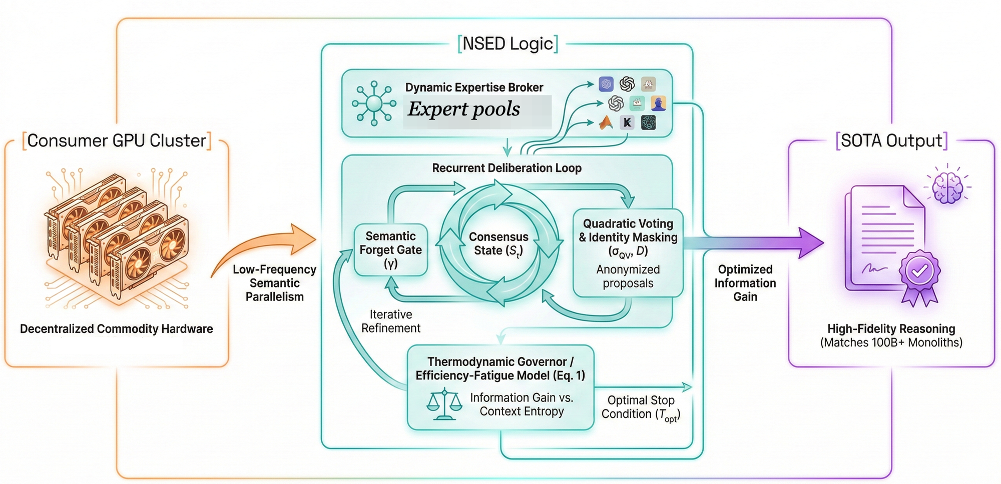 Instead of one massive model generating an answer, NSED utilizes a swarm of smaller, specialized agents (running from consumer cards like the RTX 4090 up to enterprise servers on H100s or B200s) that debate, verify, and refine an answer over multiple rounds.