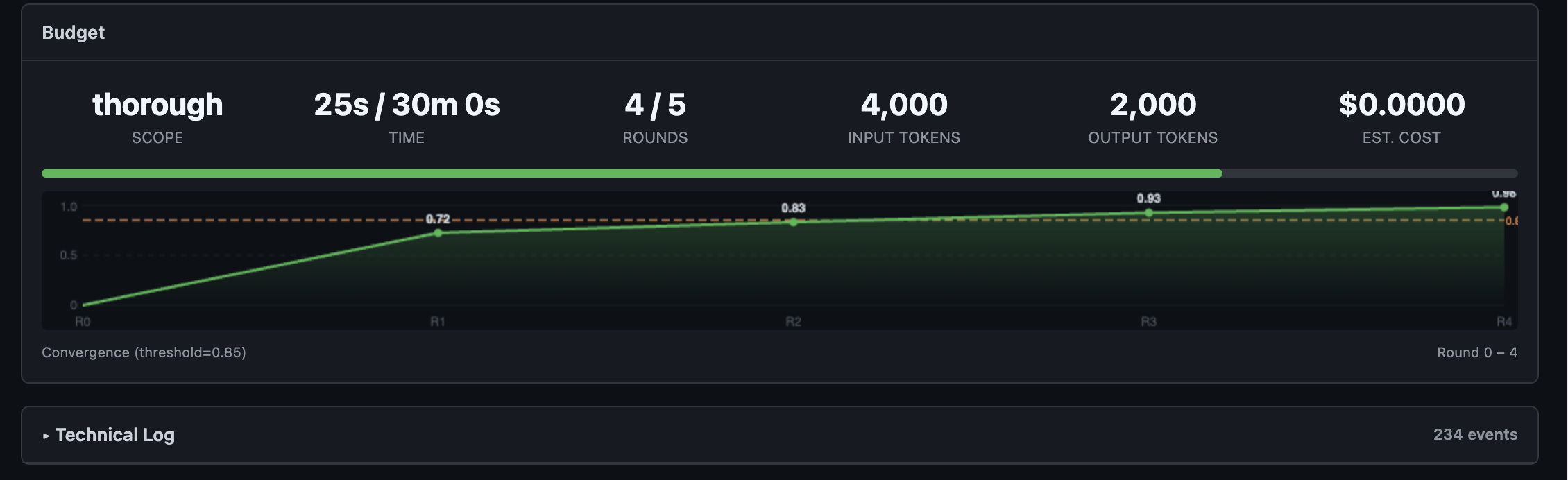 SLA-driven cost control. Set time budgets, token budgets, and cost ceilings per deliberation. The orchestrator manages resource allocation across agents and rounds — you define the constraint, it optimizes within it. No surprise API bills.