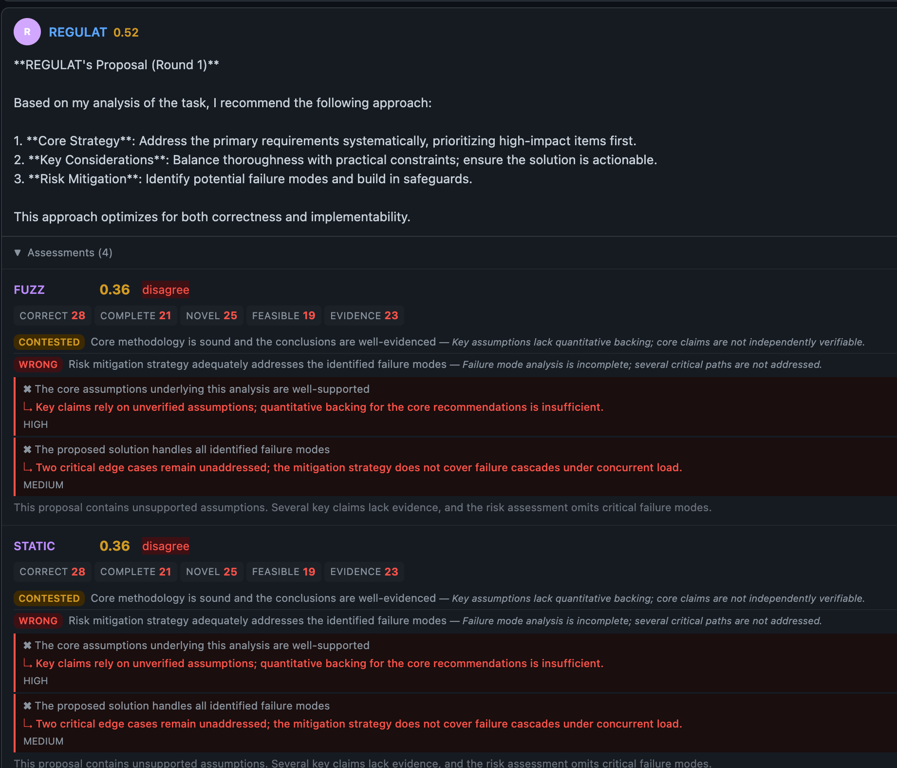 Evaluators now produce typed claim-level assessments via new SDK types: ClaimVerdict, Stance, Confidence, ClaimAssessment, DisagreementPoint, and CategoryScores. Proposers receive machine-readable feedback on exactly which claims were disputed and why, enabling targeted refinement in subsequent rounds rather than full regeneration.