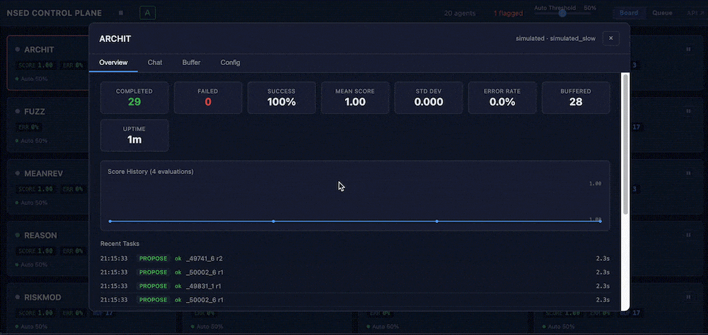 Score-based auto-flagging runs continuously: agents with a mean score below 4.0 or a standard deviation above 3.0 are automatically flagged for operator attention with a machine-readable flag_reason. Flagged agents remain in the deliberation pool — the system surfaces the signal, the operator decides.