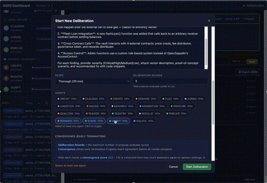 docker run ghcr.io/peeramid-labs/nsed:v0.5.1 You're two minutes from a running deliberation stack. nsed-orchestrator init handles the rest.Orchestrator has detailed view over deliberation process. For every round, detailed objections, evaluation critique appears, allows user and orchestrator operator to dig in, inject own corrections or completely kill-switch the job.